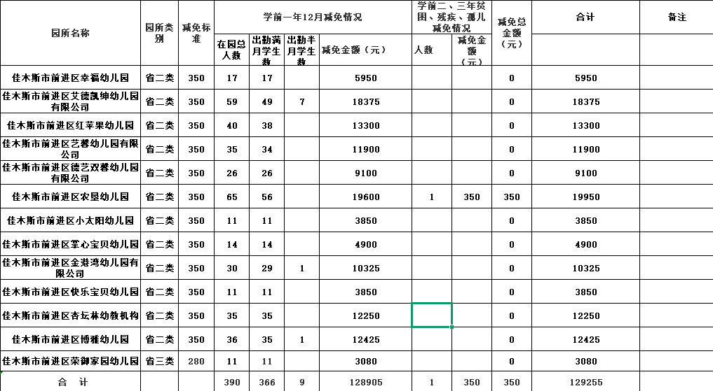 前进区民办幼儿园学前一年在园儿童保育教育费减免明细(12月)