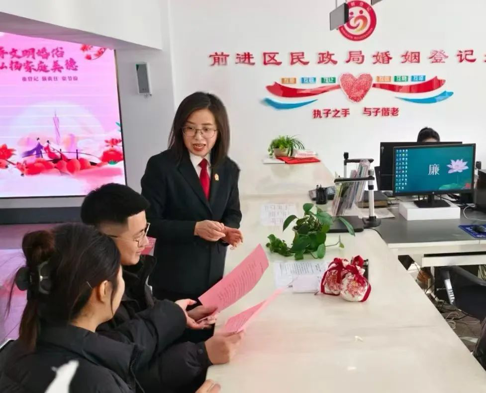 婚未联护解难题。婚姻不仅是两人的结合,更关乎家庭与社会。前进区民政局邀请市中级人民法院“青苗”未成年人保护法官工作室进驻,为3790余位新人科普婚姻法律知识,引导树立健康婚恋观和家庭观。同时设立“家 + 和”巾帼婚调工作坊,以公益讲堂、个案咨询等形式,为当事人提供婚姻辅导与心理疏导。发放宣传资料1200余份,更新公开办事流程,便民利民。