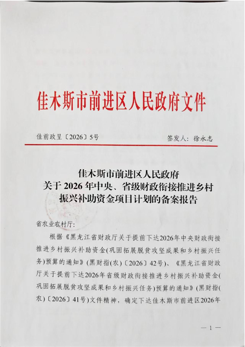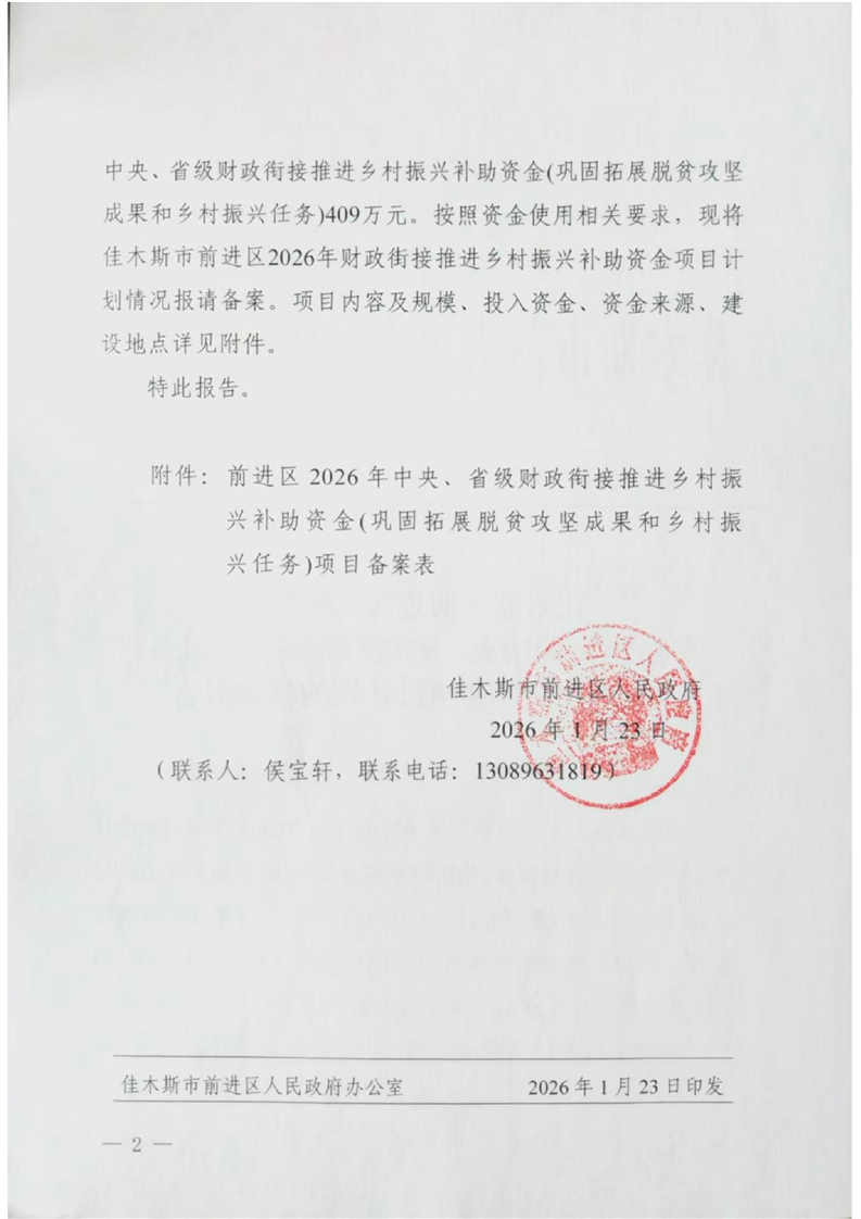 佳木斯市前进区人民政府关于2026年中央、省级财政衔接推进乡村振兴补助资金项目计划的备案报告