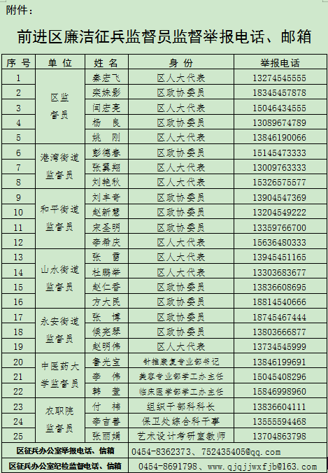 为纯正我区廉洁征兵风气,强化群众监督力度,确保征兵工作公平公开公正,现将前进区廉洁征兵监督员联系方式向社会公示。如在征兵工作过程中发现违反征接兵工作规定行为,“微腐败”“暗腐败”“吃拿卡要”等现象和问题,可进行举报。联系方式公示如下: