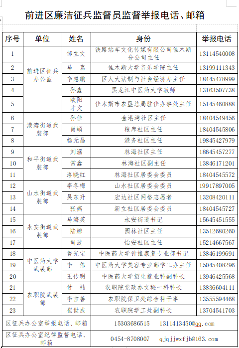 为纯正我区廉洁征兵风气,强化群众监督力度,确保征兵工作公平公开公正,现将前进区廉洁征兵监督员联系方式向社会公示。如在征兵工作过程中发现违反征接兵工作规定行为,“微腐败”“暗腐败”“吃拿卡要”等现象和问题,可进行举报。联系方式公示如下: